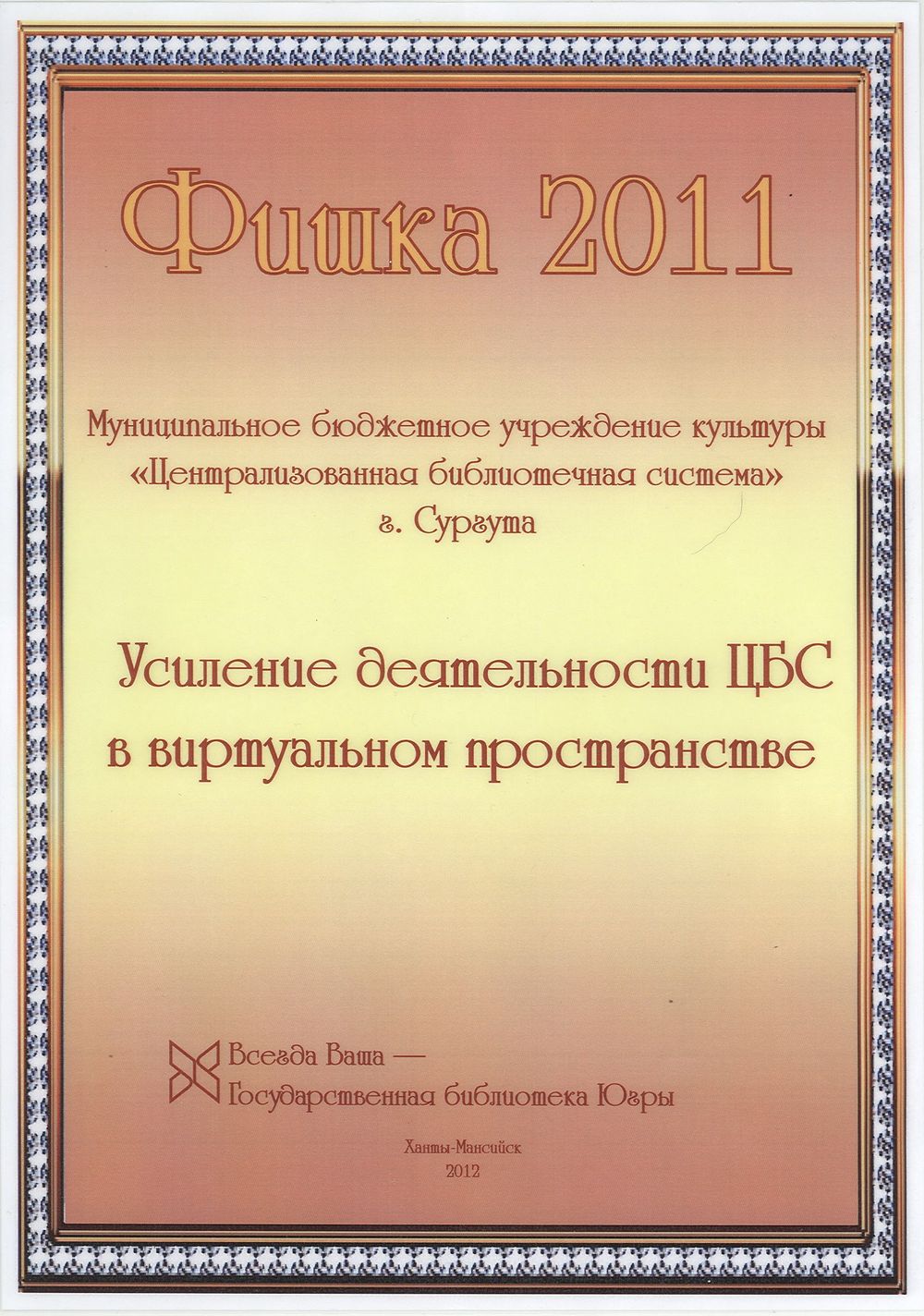 Диплом "Фишка года-2011"«Фишкой года-2011» объявлена МБУК «Централизованная библиотечная система г. Сургута» - за «Усиление деятельности ЦБС в виртуальном пространстве». Ханты-Мансийск, 2011, Государственная библиотека Югры.