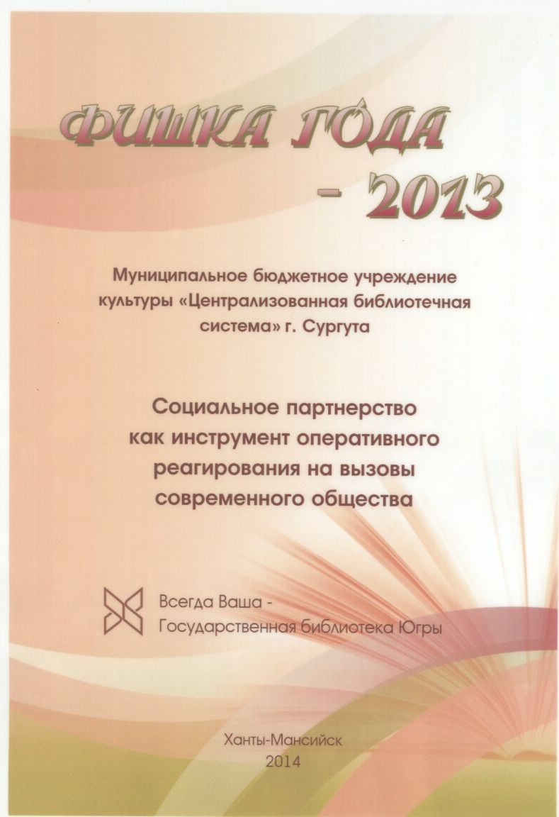 Диплом "Фишка года-2013"«Фишкой года-2013» объявлена МБУК «Централизованная библиотечная система г. Сургута» - за «Социальное партнерство как инструмент оперативного реагирования на вызовы современного общества». Ханты-Мансийск, 2014, Государственная библиотека Югры.