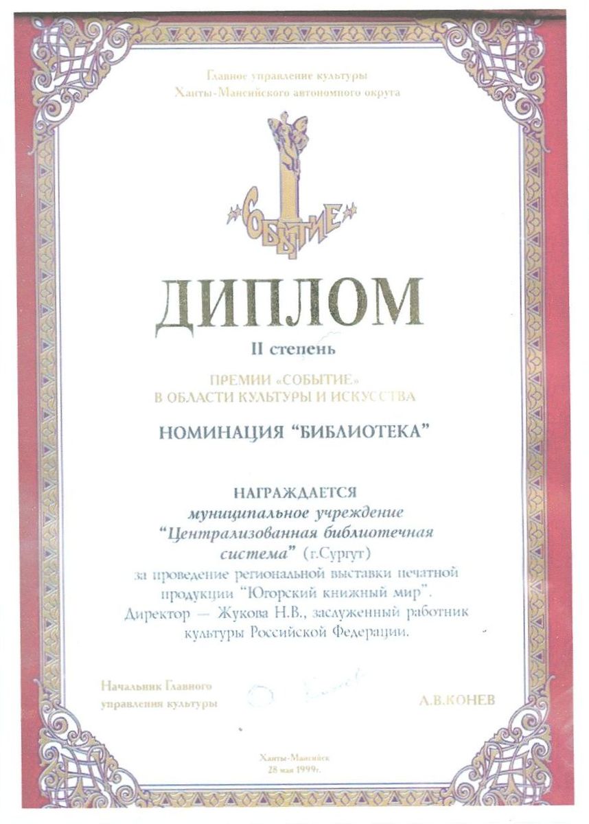 Диплом премии "Событие"Диплом II степени премии "Событие" в области культуры и искусства, номинация "Библиотека" Муниципальному учреждению "Централизованная библиотечная система" (г. Сургут) за проведение региональной выставки печатной продукции "Югорский книжный мир".