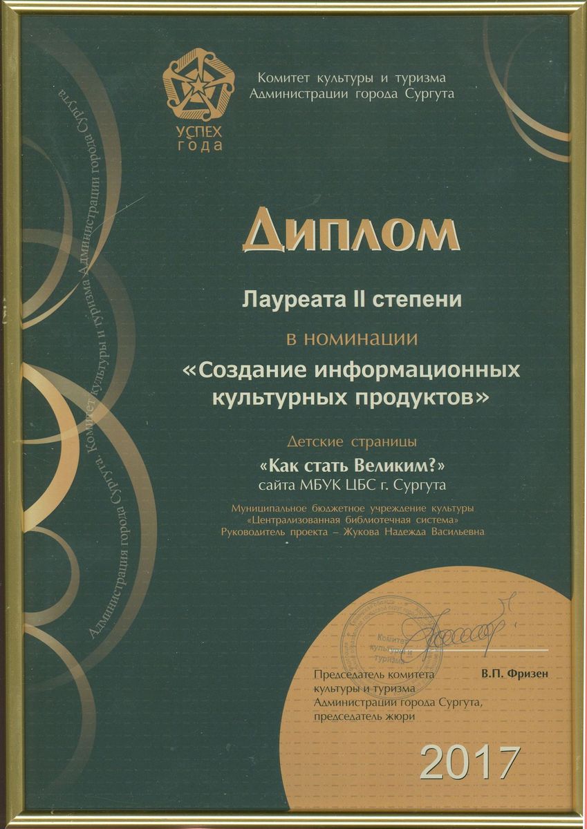 Диплом лауреата II степени конкурса "Успех года" Диплом лауреата II степени конкурса "Успех года" в номинации "Создание информационных культурных продуктов". Детские страницы "Как стать великим" сайта МБУК ЦБС г. Сургута. Руководитель проекта – Жукова Надежда Васильевна.