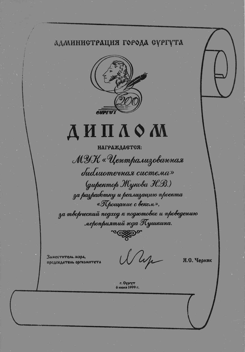 "Прощание с веком"Диплом "Централизованной библиотечной системе" г. Сургута (директор Н.В. Жукова) за разработку и реализацию проекта "Прощание с веком", за творческий подход к подготовке и проведению мероприятий года Пушкина.