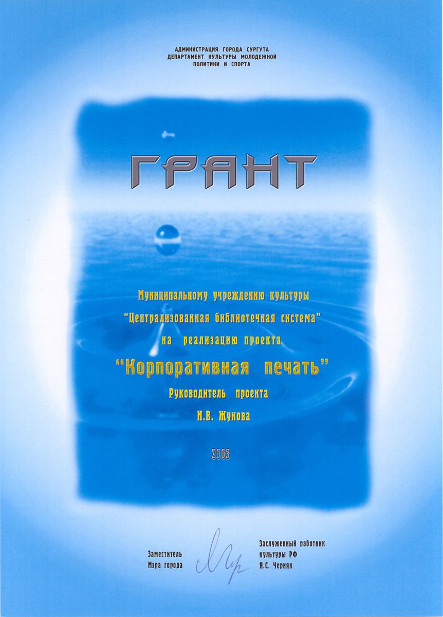 Грант "Корпоративная печать"Грант Департамента культуры, молодёжной политики и спорта Администрации города Сургута Муниципальному учреждению культуры "Централизованная библиотечная система" за проект "Корпоративная печать".