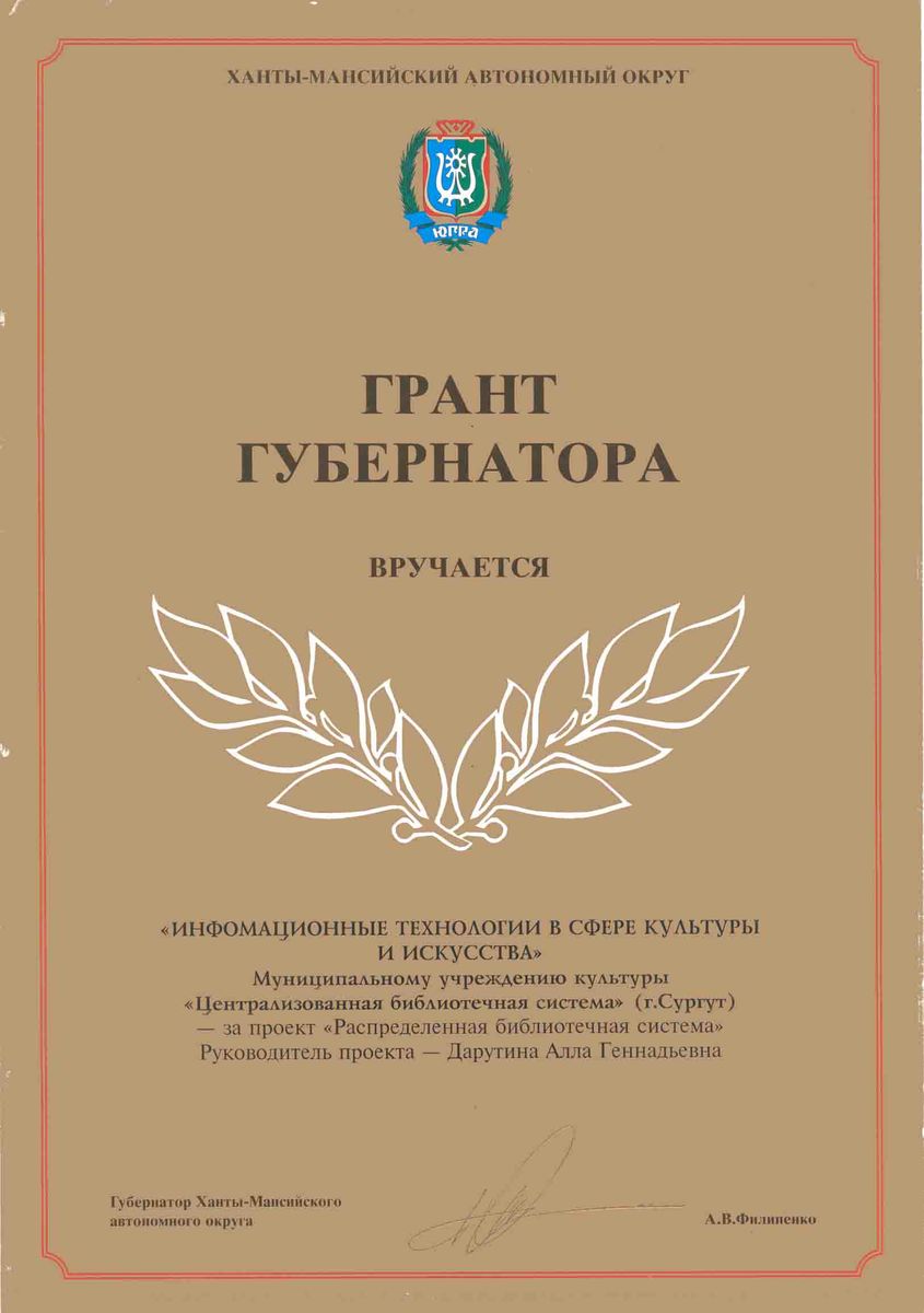 Грант Губернатора ХМАО Грант губернатора ХМАО "Информационные технологии в сфере культуры и искусства" Муниципальному учреждению культуры "Централизованная библиотечная система" (г. Сургут) за проект "Распределённая библиотечная система": Руководитель проекта Дарутина Алла Геннадьевна / Администрация ХМАО-Югры. - 1л. 21,0х29,0.